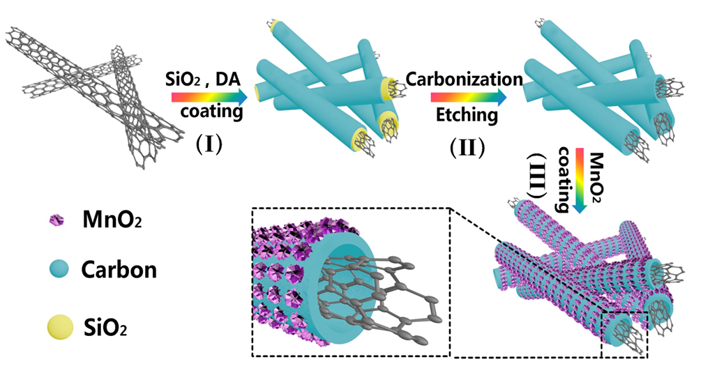 最近,POPjav低维材料与清洁能源创新型科技团队以碳纳米管(CNT)为基本骨架,通过模板法,以多巴胺为碳源和氮源,在模板二氧化硅的表面包覆了一层多孔碳层,最终构建出了双层中空碳管,经过冷冻干燥和水热等过程,成功制备出双层中空碳管与超薄二氧化锰片的复合材料(CNT@NCT@MnO2)。