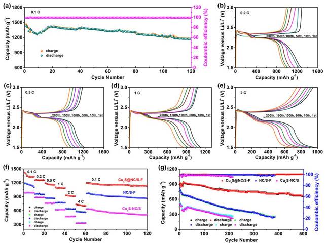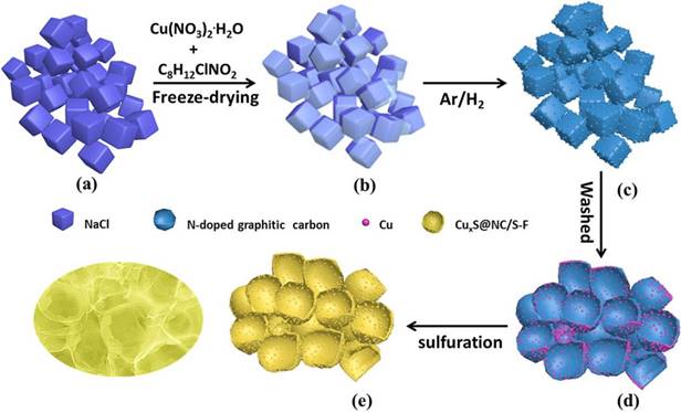 最近,我校低维材料与清洁能源创新型科技团队以氯化钠晶体为模板、盐酸多巴胺为碳源和氮源、硝酸铜为铜源,经过冷冻干燥和高温还原等过程,成功制备出铜和氮共掺杂的三维多孔石墨化碳网络复合材料(CuxS@NC/S-F)。研究发现,当CuxS@NC/S-F应用于锂硫电池方面时,具有较大的优势:I)三维多孔碳结构有利于电荷转移和电解质的浸润;II)具有良好导电性的硫化铜可以与锂反应,在锂硫电池电压范围内贡献部分容量;III)硫分子在CuxS中的分散提高了活性物质的利用率,并且Cu作为放电产物有利于提高电极整体导电性;IVCuxS材料可以作为催化剂减少放电产物(Li2S)在电极表面的不可逆沉积。因此,CuxS作为锂硫电池的硫基质具有很大的优越性和良好的应用前景。最后,作者也通过机理分析发现,作为锂硫电池的硫基质材料,该掺杂网络对聚硫化物具有高效的催化作用,并使电池表现出快速氧化还原反应的特性。