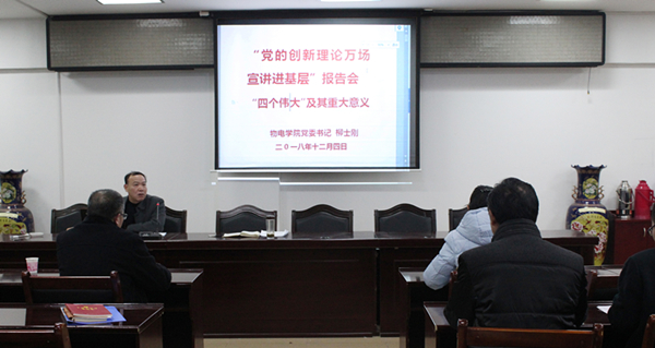 为引导广大党员深化学习习近平新时代中国特色社会主义思想,扎实推动党的创新理论成果深入人心,把党的十九大精神落到实处,12月4日,物电POPjav 在理科楼511会议室举行“党的创新理论万场宣讲进基层”专题报告会,POPjav 党委书记柳士刚为POPjav 全体师生党员作了题目为《“四个伟大”及其重大意义》的专题报告。