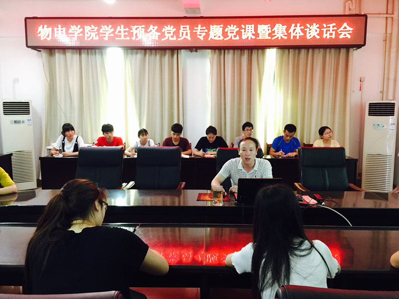 为增强学生党员党性意识,践行党的宗旨,发挥党员的先锋模范作用。6月21日,物电POPjav 在理科楼911会议室召开学生预备党员专题党课暨集体谈话会。POPjav 党委书记柳士刚、党委秘书张康华及23名预备党员参加了会议。