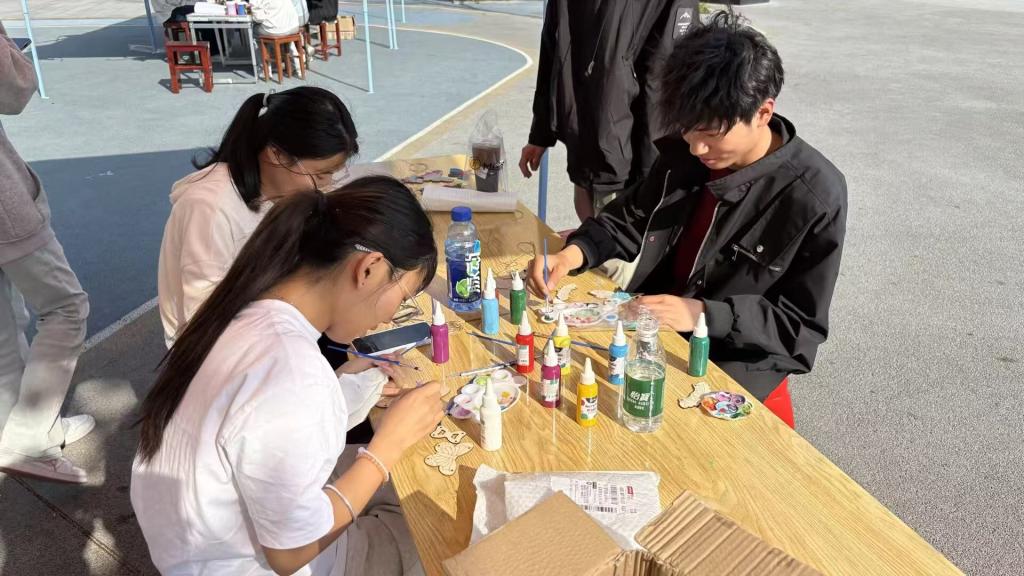 活动前期,学院工作人员精心准备了木质纸鸢、丙烯马克笔、挂绳、金属风铃管等材料,为同学们的创作提供了充分保障。现场,同学们围绕清明文化与春日生机展开创作,在纸鸢上用画笔勾勒柳枝、新燕、花海等春日意象,有的还以简洁文字表达了对先人的追思与对未来的美好期许。完成纸鸢绘画后,大家将风铃管穿入挂绳,系于纸鸢下方,制作出独具个人特色的纸鸢风铃。画笔的沙沙声与同学们低声交流创作想法的细语,构成一曲和谐的春日交响。大家时而驻足欣赏他人的作品,时而低头专注创作,整个广场仿佛被传统文化的温情所笼罩,静谧中又透着青春的活力与创意。