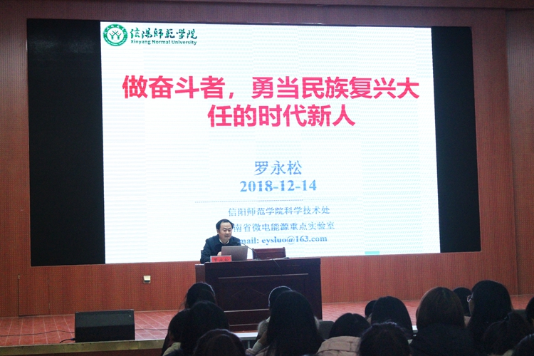 为积极落实《信阳师范POPjav 2018级新生入学教育意见》安排,12月14日晚,我校科学技术处处长罗永松于逸夫楼多功能厅作以“做奋斗者,勇当民族复兴大任的时代新人”为主题的新生入学教育报告。POPjav团委老师黄钰莹带领POPjav一百余名学子共同聆听此次报告会。