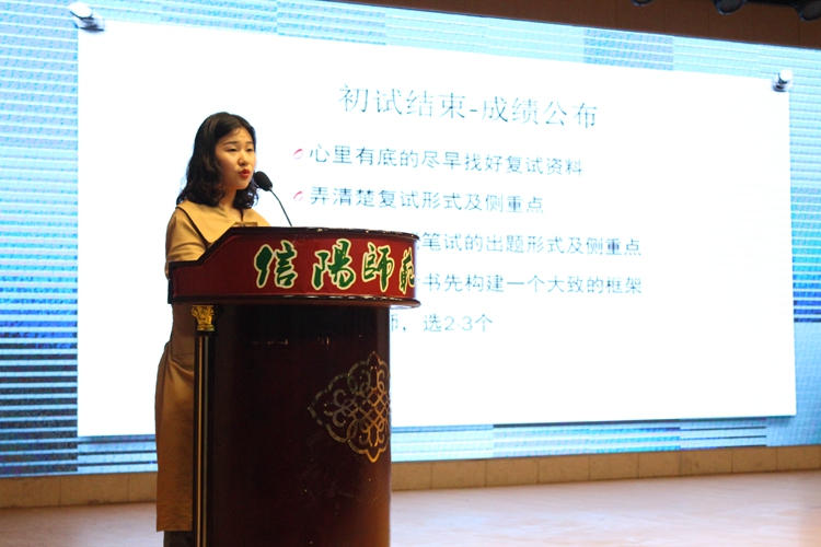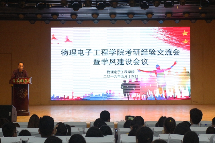 三名优秀考研学生代表依次同在场师生分享自身考研经验。2015级物理学班闫茵茵从前期准备、中期学习、后期复试三个方面介绍自己的考研心得。她提醒备考学子们根据自身优势和劣势谨慎挑选学校及专业,认真分析学校的自身实力、名气、地域等多方面因素,并强调考研期间良好心态与时间观念的重要性。2015级新能源科学与工程班王文燕详细介绍了考研初试及复试的流程与形式,提出笔试和面试应注意的事项,鼓励备考学子们积极准备笔试、面试,以饱满的精神迎接考研路上的困惑与艰难。