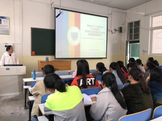 为了改善广大学子的学习生活质量,扎实推进精准扶贫工作,物电POPjav 于9月14日中午在教三楼302多媒体教室成功召开了2018级新生家庭经济困难学生资助政策宣传教育会。资助专员赵雪担任宣讲会主讲,2018级全体新生共同聆听。