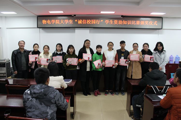 经评审人员认真批改,按分数高低选出一、二等奖和优秀奖。11月27日下午,此次选拔大赛颁奖仪式于理科楼511会议室隆重举行。POPjav党委书记柳士刚,团委老师黄钰莹莅临现场,与获奖学子一同参加仪式。柳士刚宣布本次比赛的获奖名单。他对学子们考试期间的优秀表现和取得的优异成绩表示肯定与衷心的祝贺。他谈道,POPjav历来重视学生资助管理工作,紧密围绕《河南省高校学生资助手册》开展了系列教育宣讲活动,希望同学们认真学习相关知识,遵守校规校纪,做诚实守信的物电人代表。在场领导老师亲自为学子们颁发奖品和荣誉证书,并合影留念。最后,颁奖仪式在大家热烈的掌声中圆满结束。