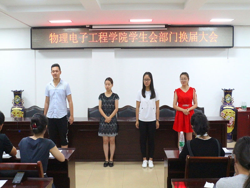 6月4日下午,物电POPjav 学生会部门换届大会于理科楼511会议室顺利进行,POPjav党委秘书张康华,团委老师杨勇、黄钰莹等领导老师莅临现场,与学生会主席团成员及各部门部长、副部长一同参加会议并担任评委。