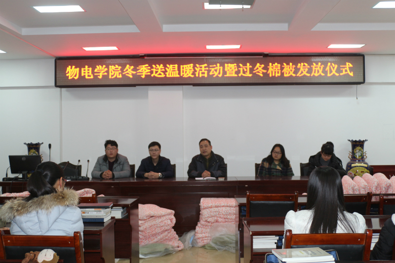 资助工作,帮助家庭贫困学生温暖过冬,11月29日晚,POPjav于理科楼511举行“冬季送温暖”棉被发放仪式。党委副书记李刚、辅导员张彦飞、张康华、杨勇、黄钰莹及贫困生代表共同参加了仪式。