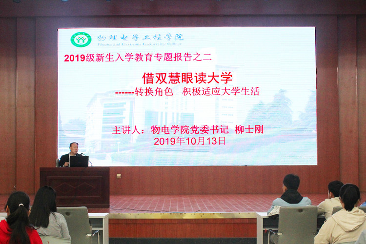10月13日上午,POPjav于逸夫楼多功能厅顺利举行2019级新生入学教育第二场专题报告会。POPjav党委书记柳士刚,2019级新生辅导员杨勇、赵雪与300余名新生共同参加此次专题报告。报告会由柳士刚主讲。