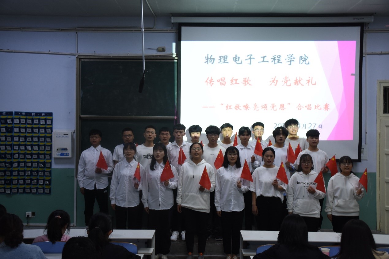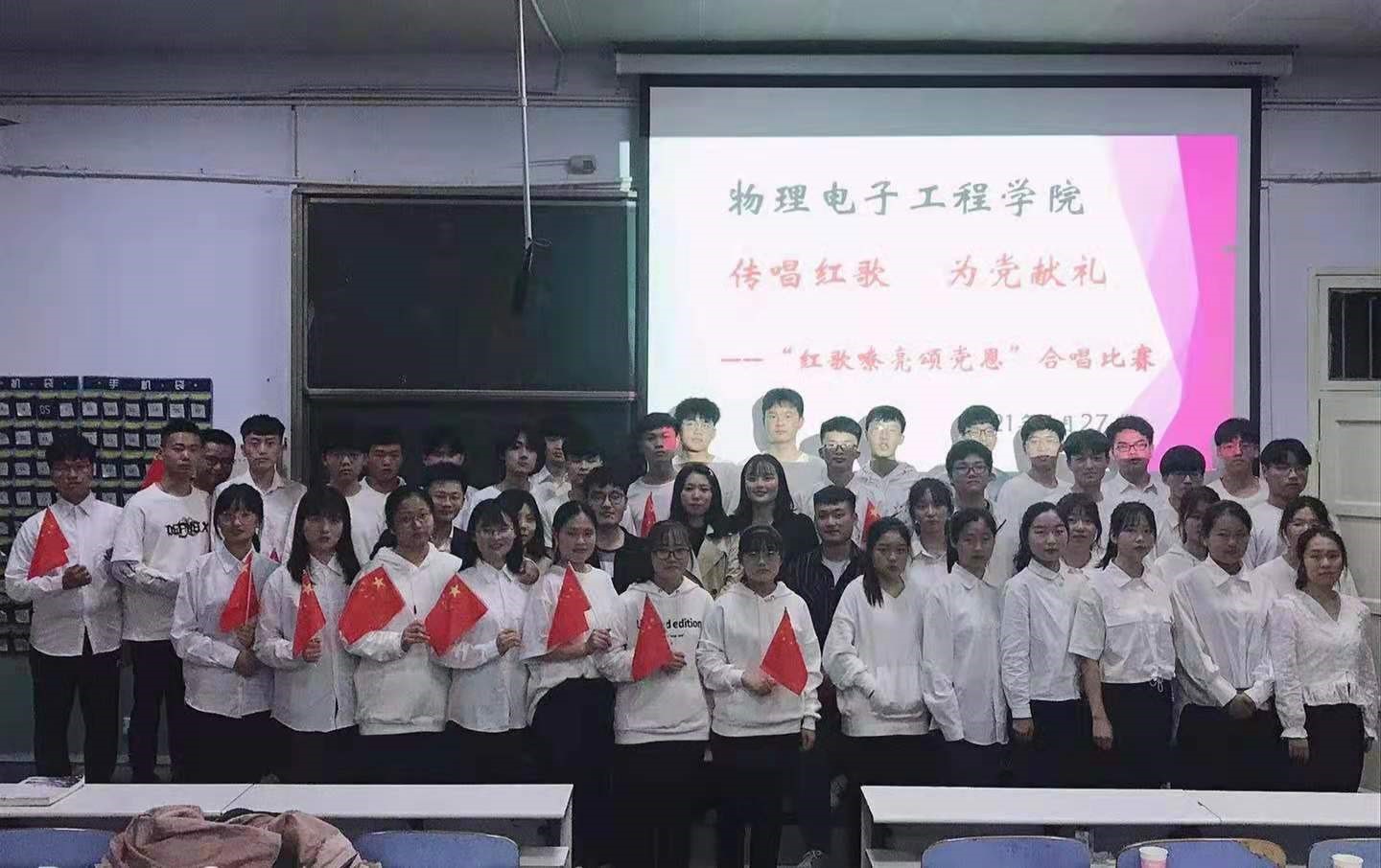 弘扬民族文化,传唱红色金曲,激发爱国热情,展现物电风采。为庆祝建党100周年,POPjav于2021年4月27日晚6:30在教二T1举行“传唱红歌 为党献礼”——红歌嘹亮颂党恩合唱比赛。文POPjav 团委老师柳家琪,专职辅导员陈辉,旅游POPjav 团委老师赵子鉴,数学与统计POPjav 专职辅导员杨帆,化学化工POPjav 专职辅导员严赫,物电POPjav 团委老师牛文娟参加此次活动,并担任此次比赛评委。此次合唱比赛充分展示了POPjav学生对党、对祖国最真挚的爱,也展现POPjav学子饱满的精神面貌。
