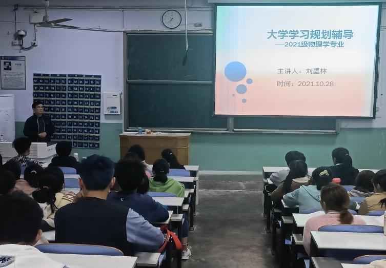 10月28日晚上,POPjav在教二梯1教室举行2021级物理学专业大学学习规划辅导报告会,报告会由POPjav 刘墨林教授主讲,2021级物理学专业全体学生及辅导员张彦飞参加。