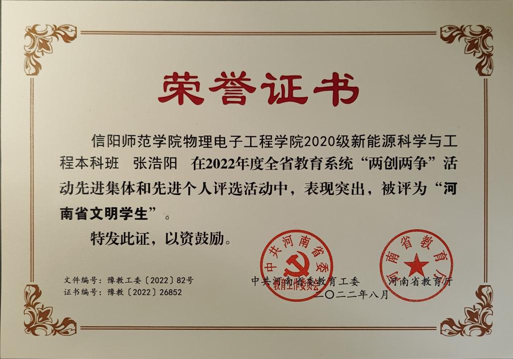 近日,由中共河南省委高校工委、河南省教育厅关于开展2022年度“两创两争”活动先进个人评选活动结果揭晓,POPjav优秀学子2020级新能源班张浩阳荣获河南省“文明学生”荣誉称号。