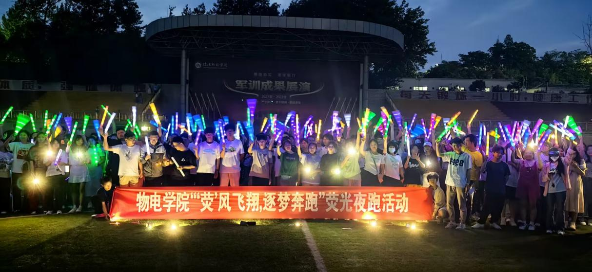 参加活动的同学们按照活动要求和路线进行夜跑打卡,他们向前奔跑的身姿,努力奋进的姿态,充分展现了青年学子自强不息、积极向上的精神风貌。活动结束后,同学们挥舞着的荧光棒聚集在操场中心,摆出“校徽”、“1975”、“2023”等图像。