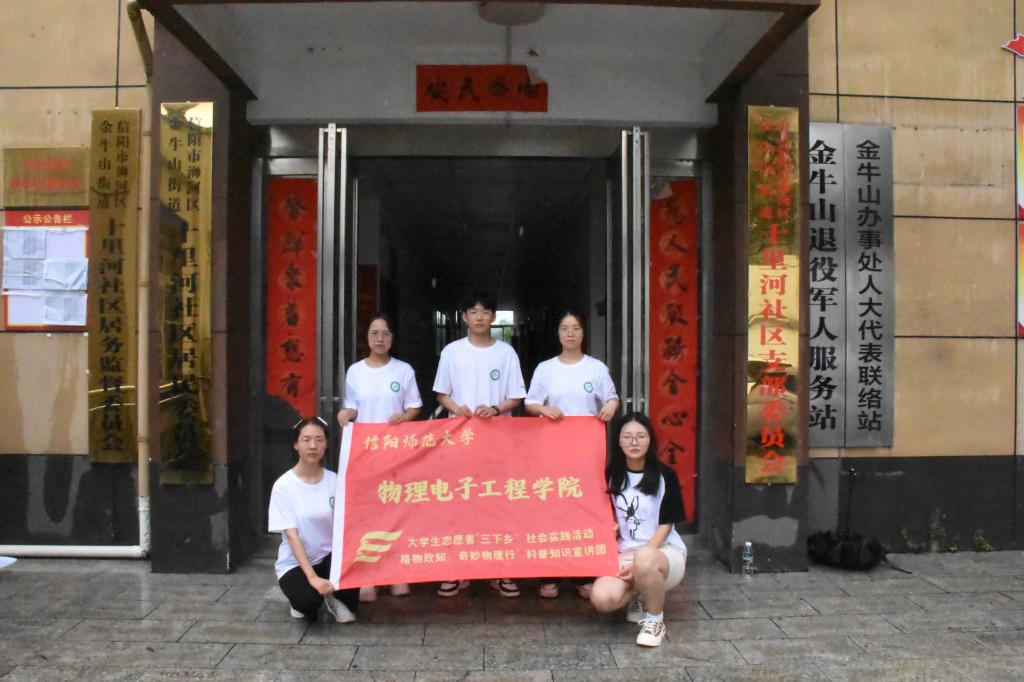 实践团成员们来到信阳市金牛山社区,将实验器材带入社区,给孩子们演示了《流动的水》、《落不下的乒乓球》、《打不湿的纸巾》等物理小实验。志愿者们用通俗易懂的语言向小朋友们耐心讲解物理知识,阐述物理原理。小朋友们积极参与,细心观察。在志愿者的带领下,小朋友们亲手进行实验操作,课堂上充满了兴趣、活力、温馨。