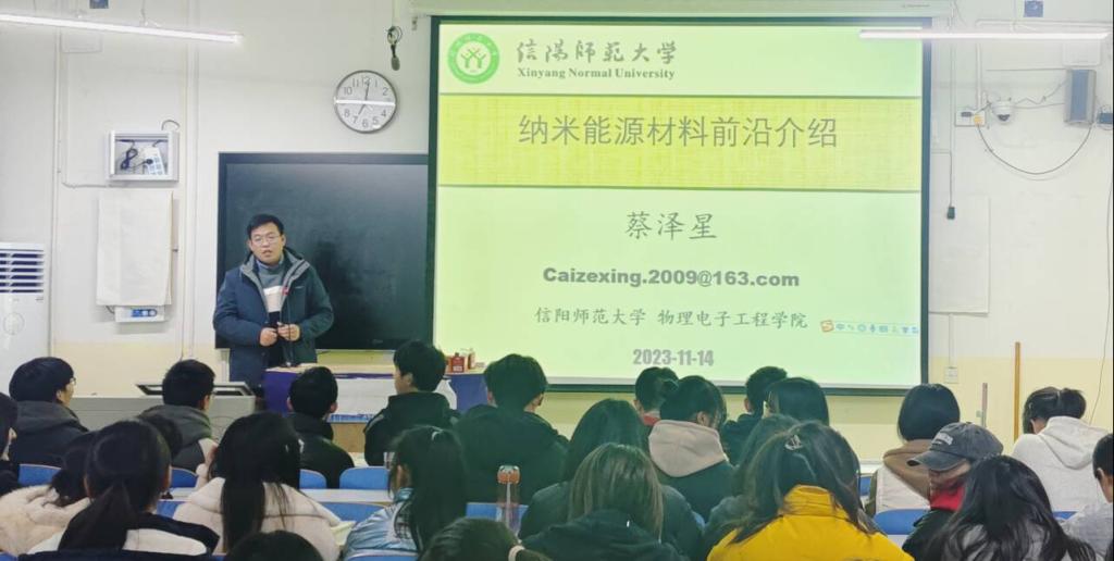 11月14日,POPjav于教三205举行格致讲坛系列之“纳米能源材料前沿介绍”。讲座由蔡泽星主讲,2022级新能源科学与工程班全体同学参加。