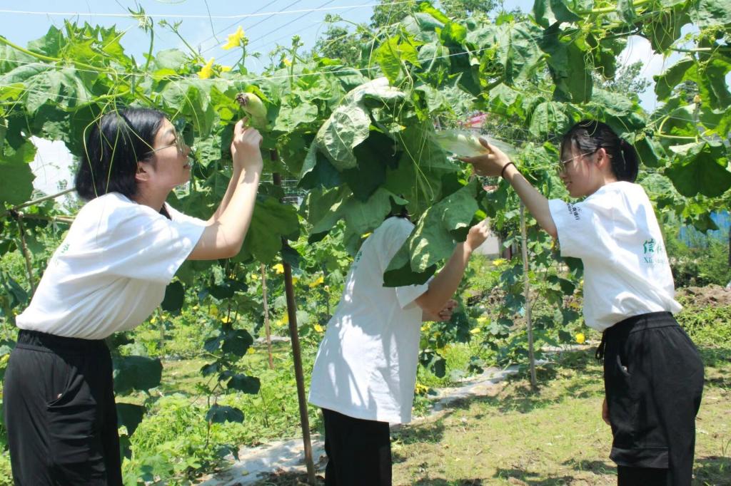 实践团成员们走进白玉丝瓜田地,帮助村民浇水、除草、施肥、套袋、掐秧等农活。白玉丝瓜在生长过程中,需要及时浇水,保持土壤湿度;及时除草、施肥、掐秧,保证果实的质量和产量。这些农活给村民带来很大的困扰,成员们用勤劳的双手帮助村民解决田间农活,减轻村民的劳动量,提高村民的生活幸福感。
