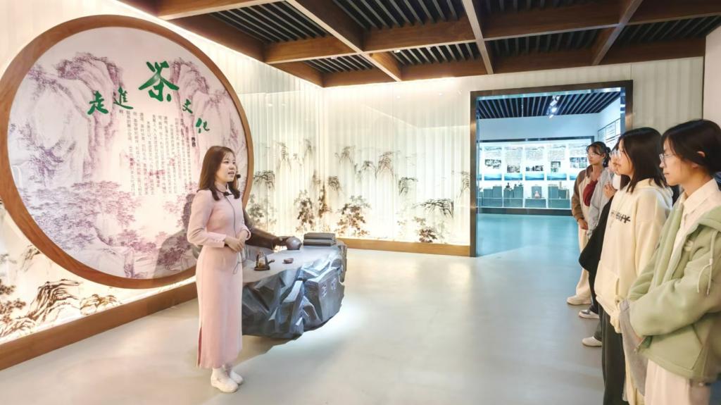 随后,同学们前往茶文化馆进行参观。讲解员详细介绍茶的分类以及制作流程,并分享相关名人故事,让学生对茶文化的历史有了更深刻的认识。展馆内还设置沏茶表演环节,表演者以优雅流畅的动作展示传统技艺,让同学们感受到茶文化的魅力。