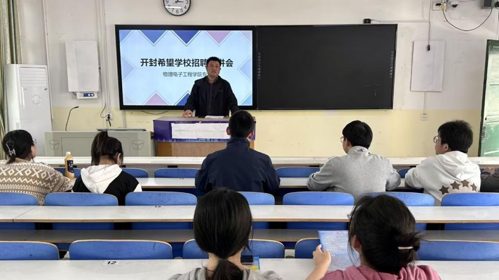宣讲会现场,开封希望学校招聘负责人介绍了学校的地理位置、师资力量、所获奖项、规章制度、福利待遇等,并就人才招聘录用的流程以及岗前培训等进行了详细的讲解。会后,招聘负责人与毕业生在工作发展前景、合同签订等相关事宜方面进行了交流。