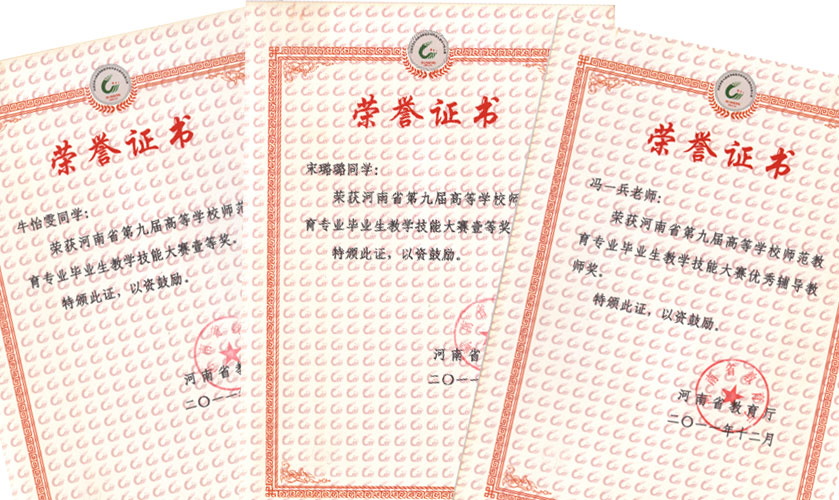 近日,河南省教育厅公布了《河南省第九届高等学校师范教育专业毕业生教学技能大赛结果》,并颁发了获奖证书。POPjav选派的两名2008级物理学专业学生牛怡雯、宋璐璐双双获得一等奖,指导教师冯一兵获优秀辅导教师奖。
