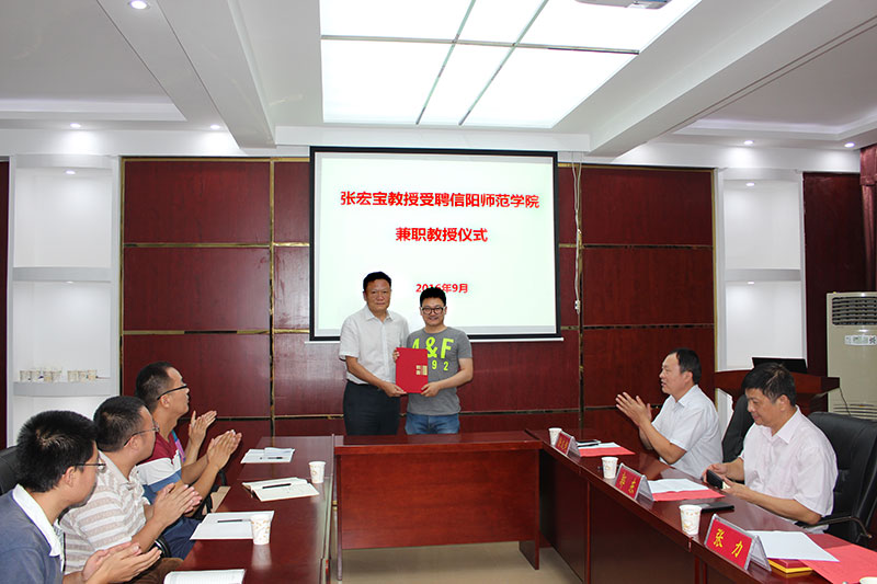 的学科概况和发展趋势,对张宏宝博士的加盟表示热烈欢迎,高度评价了张宏宝博士的学术成就,希望张宏宝博士的加盟能够带动我校物理学科的发展,并代表学校向张宏宝博士颁发了兼职教授聘任证书。张宏宝博士在发言中表示了感谢,并表示将竭尽所能履行职责,为科研合作和学科建设与发展贡献自己的力量。