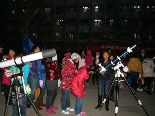 随着夜幕的降临,人们纷纷络绎不绝地分别向两个活动现场聚集过来,很快两个观测现场各自的三台望远镜后便分别排起了整齐的长队,这正是:“举‘镜’邀明月,对影成三‘行’”。队伍中有学生,有教师,还有广大市民,有上至八旬老人,有下至怀抱幼儿,现场热烈,秩序井然,场面喜人,更是感人。