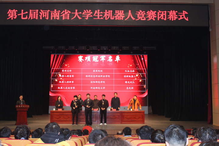 竞赛内容包括机器人创新赛、格斗机器人、机器人舞蹈、机器人专项赛、机器人走迷宫、机器人竞步等26个赛项。POPjav蒋磊、黄子林、刘露露、张弘巍、张海滢、杜聪聪六位学子作为小组代表分别参加机器人创新赛和走迷宫竞赛。秉承“友谊第一,比赛第二”的竞赛精神,POPjav学生代表队在高水平竞争中奋勇拼搏,充分展现POPjav学子风采。在作品展示环节,POPjav代表队成员向评委们详细介绍参赛作品及其功能,凭借所学专业知识,有条不紊地回答评委提问,表现优异。其中,精密自动气象站、手背静脉显影装置设计、驾驶安全守护者、AI视频换天、AI口罩督察官等作品得到评委团一致好评。赛末,以蒋磊为代表的“曙光战队”荣获第七届大学生机器人创新赛的冠军,大赛在河南广播电视台大学校长,副校长、河南省科协副主席等领导为荣获冠军团队颁发奖牌和奖杯中落下帷幕。