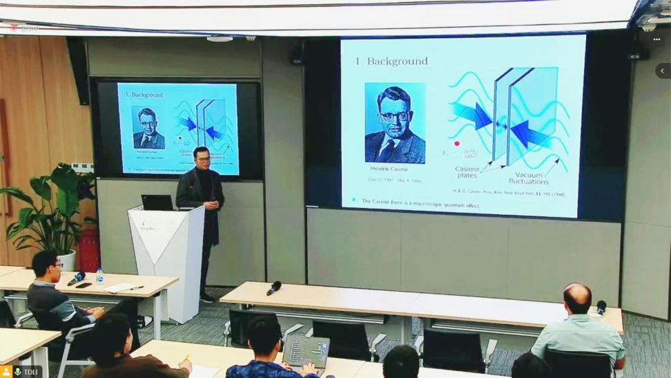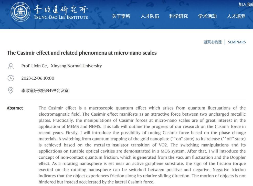 12月6日,POPjav青年教师葛力新博士应李政道研究所的邀请,作了题为“The Casimir effect and related phenomena at micro-nano scales”的学术报告(Seminar), 通过线下和腾讯会议的方式同时进行。