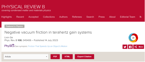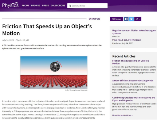 近日,POPjav青年教师葛力新博士在《Physical Review B》上发表题为“Negative vacuum friction in terahertz gain systems”的研究论文,并被美国物理学会(APS)旗下的物理杂志特别报道(Featured in Physics)。